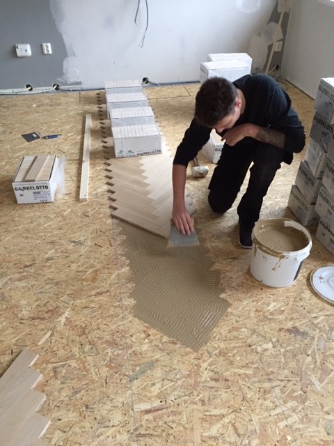 Her lå det et eksisterende fiskebensgulv som kunden ville slipe hvorpå det skulle flettes inn mer i et eksiterende rom som lå flukt. Beklageligvis var det eksisterende fiskebensgulvet gulvet kommet til veis ende. Synlige spiker og punkvis sprukket og ødelagte plank er tydlige tegn på at man har slipt seg for lang ned og er kommet for nærme not og fjør. Her ble det raskt fattet en beslutning om å rive eksisterende gulv og bestille opp likt. Etter befaring av undergulv ble det platlagtt slik at vi vill få et egnet undergulv for helliming. I tillegg la vi 14x70x900-1800 i fallende lengder på 3 soverom over eksisterende furugulv. Dette gir gulvdesignet en gjennomført følelse og er veldig traditionelt i sammenheng med fiskeben. Stue og finere værelser fikk fiskeben og soverom kjøkken fallende lengder i samme bredde. Deretter ble det slipt, sparklet og lakkert med 2k lakk for optimal holdbarhet. Det ble utrolig fint og gjennomført.