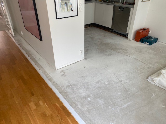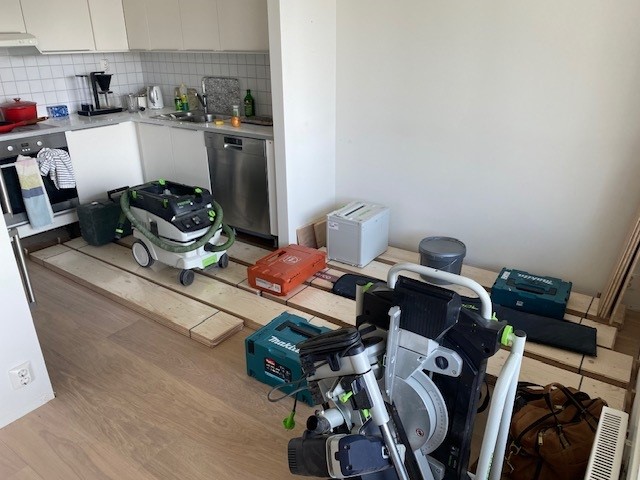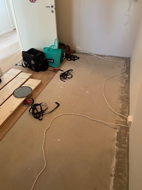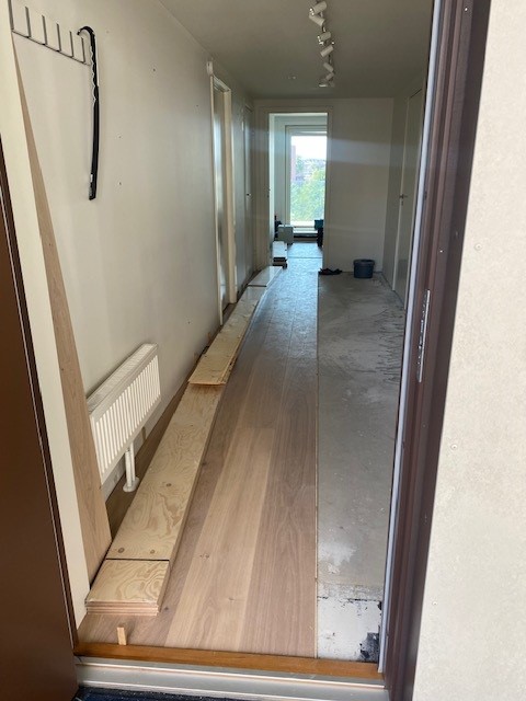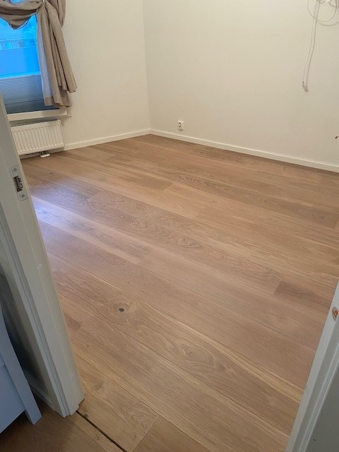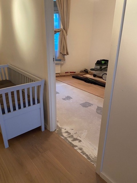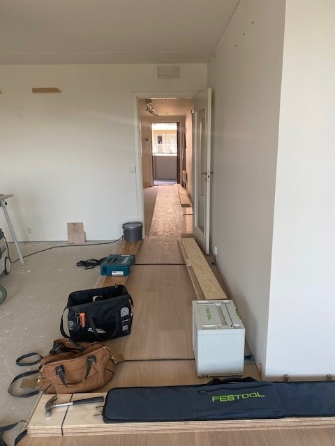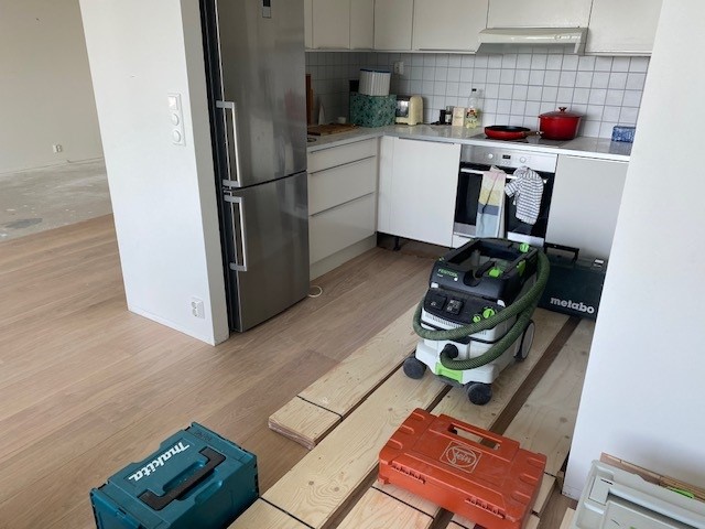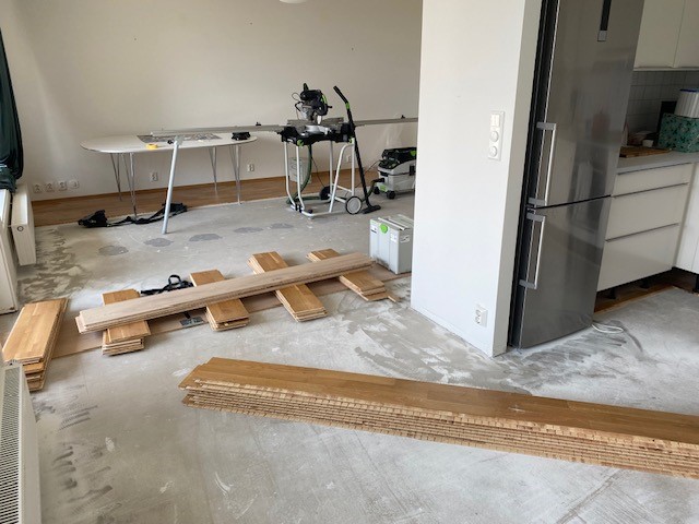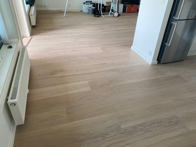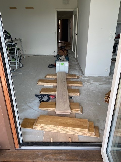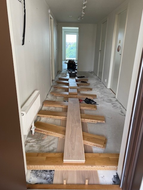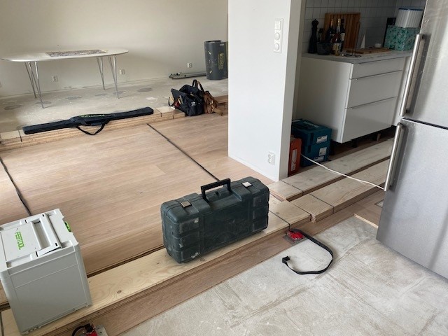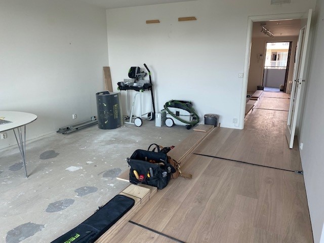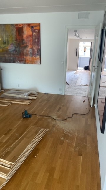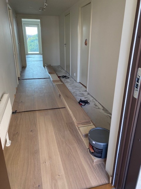 Da dette var en forsikrings jobb hadde byggherre bedt om å få kontant oppgjør. Dette er en ryddig måte og få oppgradert gulvene hvor man får litt økonomisk drahjelp fra kontant oppgjøret. Etter saneringen var ferdig og det var tørt, var det bare å begynne å rive det eksisterende trestavs gulvet. Det ble nødvendig å slipe undergulvet litt lokalt etter mye malingsøl fra tidligere malings arbeid. Deretter var det bare å etablerer startlinje fra gangen og inn til stue/kjøkken og la bitene falle på plass. Jobben måtte deles opp i 2 omganger, da det var en del møbler og håndtere internt. Etter gulvene var på plass listet vi samt slipte og pigmenterte 4 eksiterende terskler slik at de matchet gulvene.
