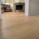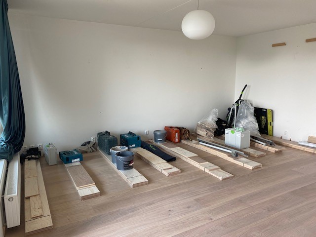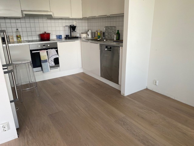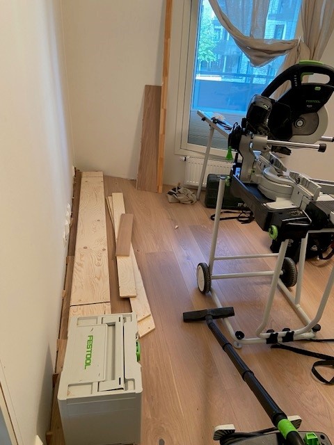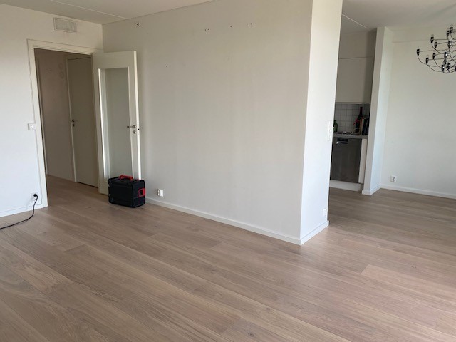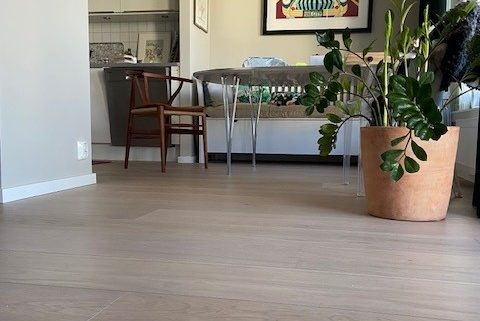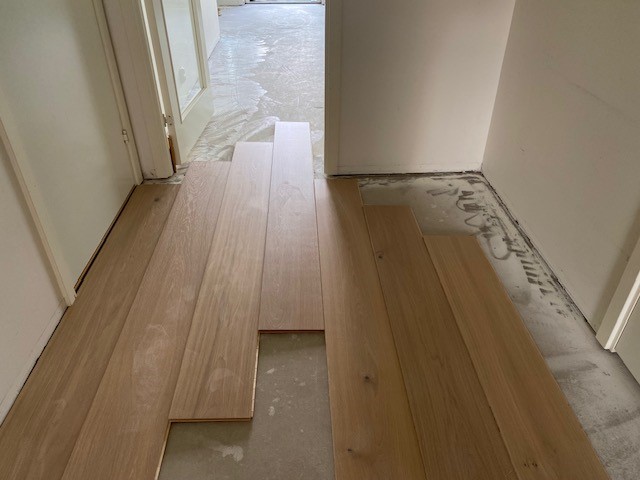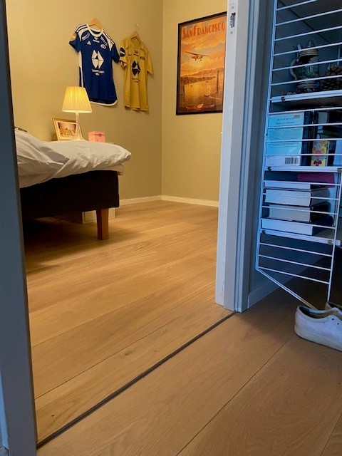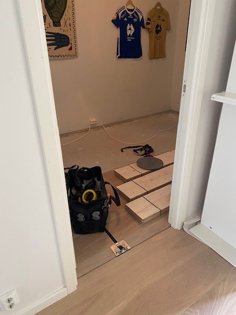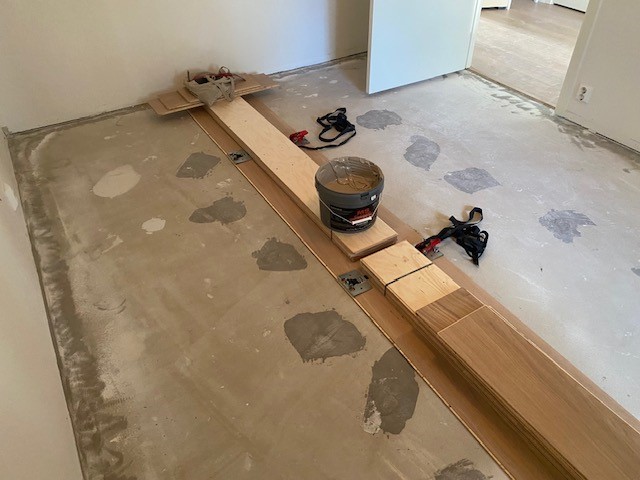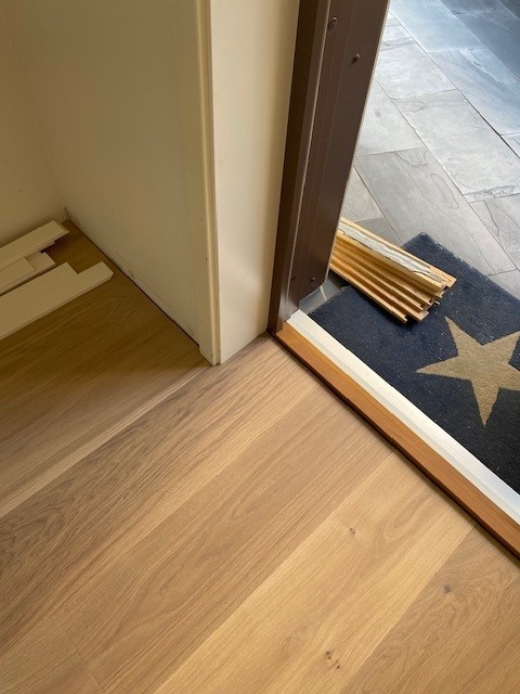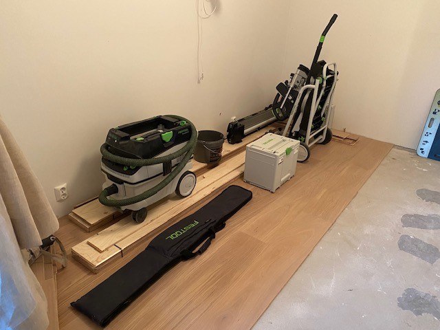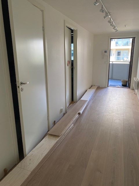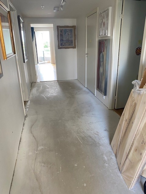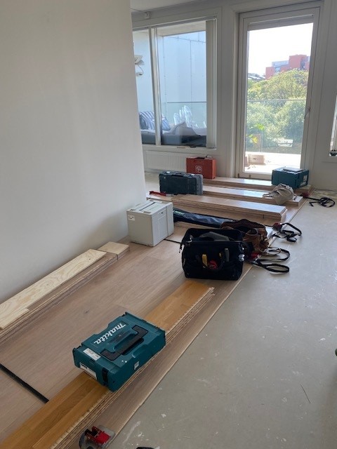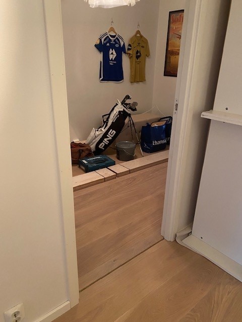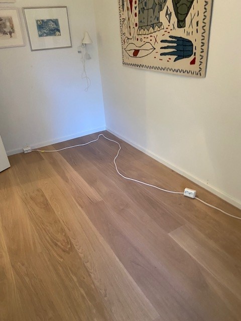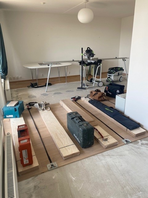 Da dette var en forsikrings jobb hadde byggherre bedt om å få kontant oppgjør. Dette er en ryddig måte og få oppgradert gulvene hvor man får litt økonomisk drahjelp fra kontant oppgjøret. Etter saneringen var ferdig og det var tørt, var det bare å begynne å rive det eksisterende trestavs gulvet. Det ble nødvendig å slipe undergulvet litt lokalt etter mye malingsøl fra tidligere malings arbeid. Deretter var det bare å etablerer startlinje fra gangen og inn til stue/kjøkken og la bitene falle på plass. Jobben måtte deles opp i 2 omganger, da det var en del møbler og håndtere internt. Etter gulvene var på plass listet vi samt slipte og pigmenterte 4 eksiterende terskler slik at de matchet gulvene.