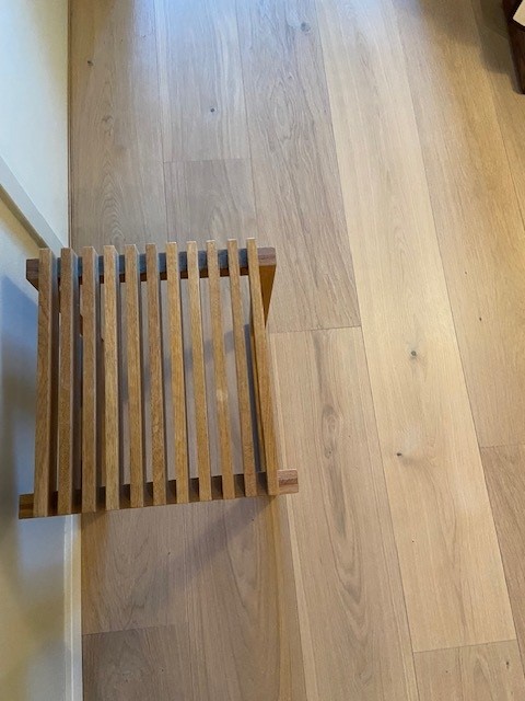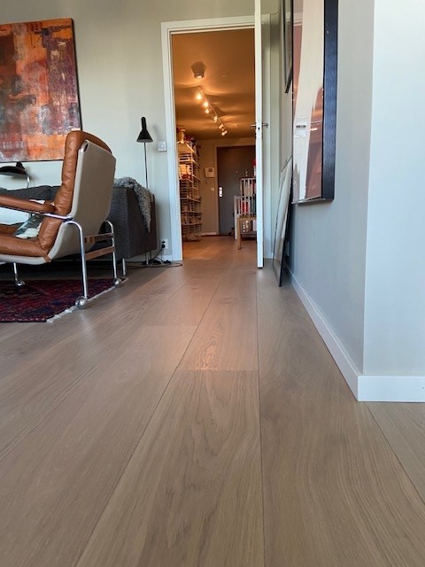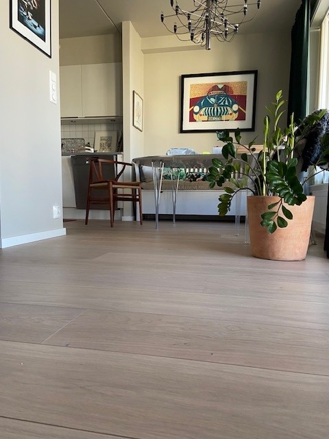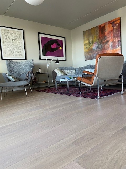 På dette prosjektet ble jeg kontaktet av en gammel venn fra ungdoms tiden, som trengte vår hjelp. Han hadde fått en vannlekkasje og måtte rive de eksisterende 3-stavs eike gulvene sine. Nå ville han oppgradere, og ønsket seg en eksklusiv, lyst og bred 1-stavsparkett i eik. Etter noen møter på showrommet som mest gikk til å mimre om gyllende tider, falt valget på den delikate Natural White fra Esco. Chateau serien er slipt og ferdig hvit pigmentert med hardvoksolje. Kvist sorteringen heter elegance/superb og tillater noen kvist. Med dimensjoner 14x225x1800-2400 gir det et bred og elegant utrykk.