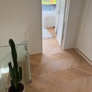 Her skulle samtlige rom få nytt gulv. Det ble valgt fiskeben i stuen, gang og på det ene soverommet. En mellomgang inn til kontor og soverom fikk heltre eik i fallende lengder. Dette gjør at den «røde tråden» i gulv designet opprettholdes og man får et helhetlig og gjennomført utrykk. Vi valgte og skifte retningen på fiskebens gulvet i gangen som møter stuen. Her tverlegger vi noen bord for å markerer skille. Deretter slipes og overflatebehandler vi. Her ble det valgt en utrolig fin mørkebrun farge.