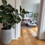 (www.flytas.no) dro oss inn for å bistå med rett valg av gulv. Det ble fiskeben fra Panaget 12x90x590 i en lys farge (linen) i de store sammenhengende stuene og kjøkkenet. Otello 14x139x400-2000 i samme farge ble lagt på soverom og gang. Dette gjør at man får en fin tråd som snører alle gulvene sammen. Da det er varmekabler i undergulvet er dette en optimal løsning da begge gulvene er lamellkonstruksjon og tåler undervarme.