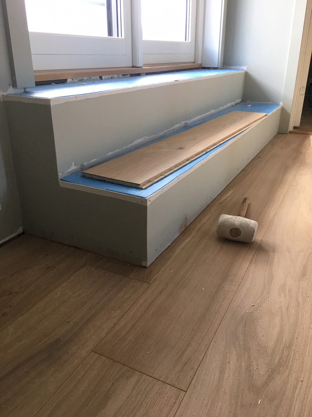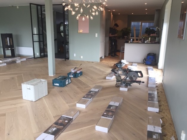 Her ser du fiskeben fra ter Hürne 12x162x1082 i raw effekt fargen, som har en lys fremtoning slik ubehandlet eik har. Med børstet mattlakert overflaten og rustikk sorteringen gir det gulvet et utrolig autentiske, genuint og vakkert preg. I samspill med de store bordene gir det et praktfult, tradisjonelt, men også moderne utrykk. Det spesielle med dette fiskebensgulvet er at det er en klikk løsning, som må hellimes. Da det var silencio plater under det eksisterende gulvet måtte denne fjernes da helliming ned til silencio ikke er mulig. For å kompenserer høyden ble det lagt ned osb plater, slik at vi fikk et egnet undergulv å hellige på. Så var det bare å begynne prosessene. Senter og startlinje blir etablert og leggingen kan begynne. Det gode med denne klikk løsningen som må hellimes er at bordene låser seg på plass. Der tradisjonell fiskebensparkett i not og fjær har en tendens til å skli og bevege seg, slik at man hele tiden må passe på at de ligger tett, gjør klikksystemet at man slipper å engste seg for dragninger og utsklielser. Klikkløsningen i samspill med de store bordene gjør at det går overraskende fort å legge mange m2 i timen.